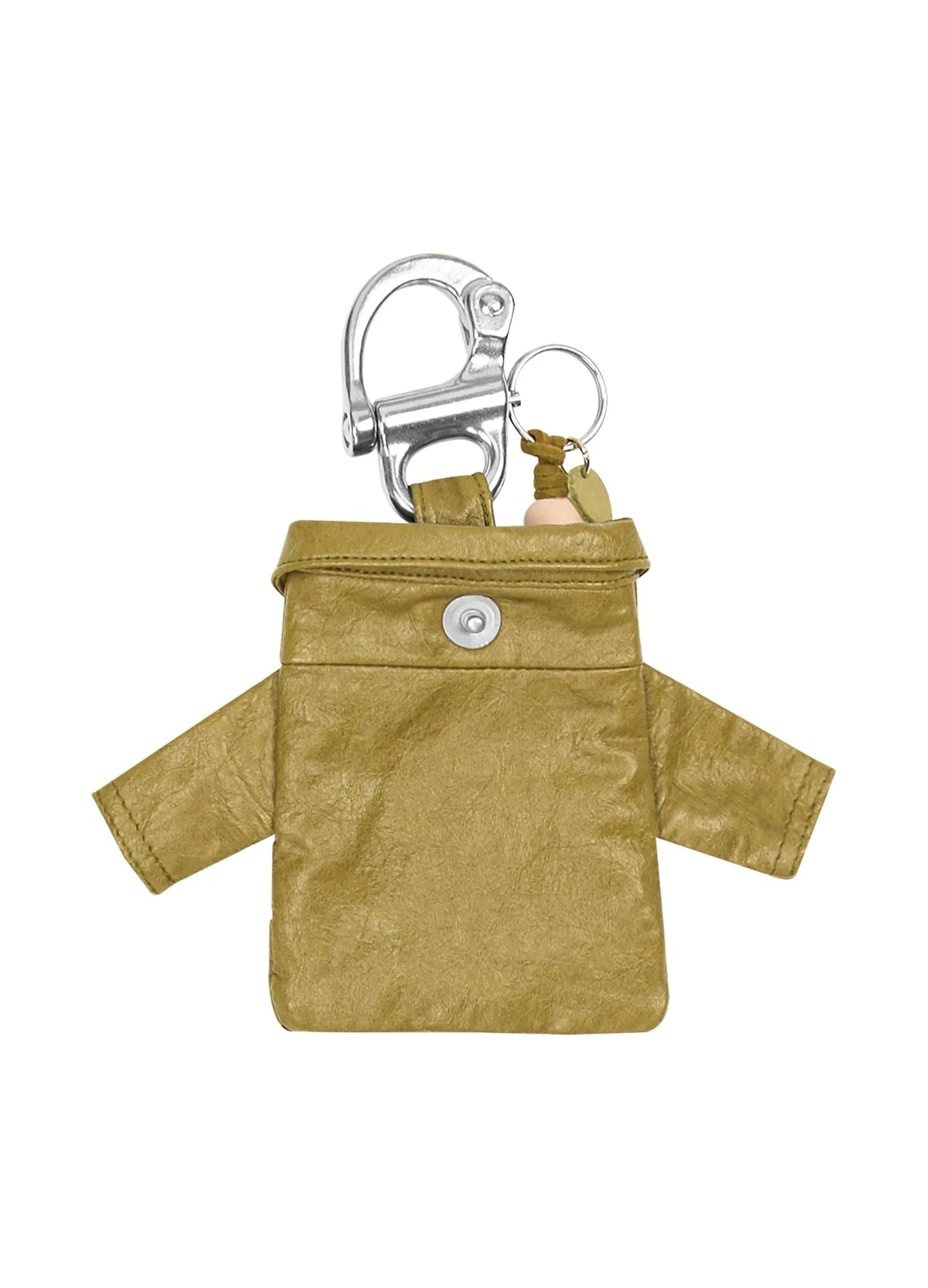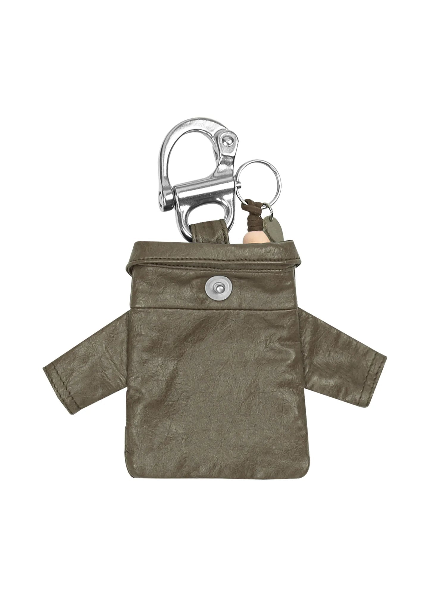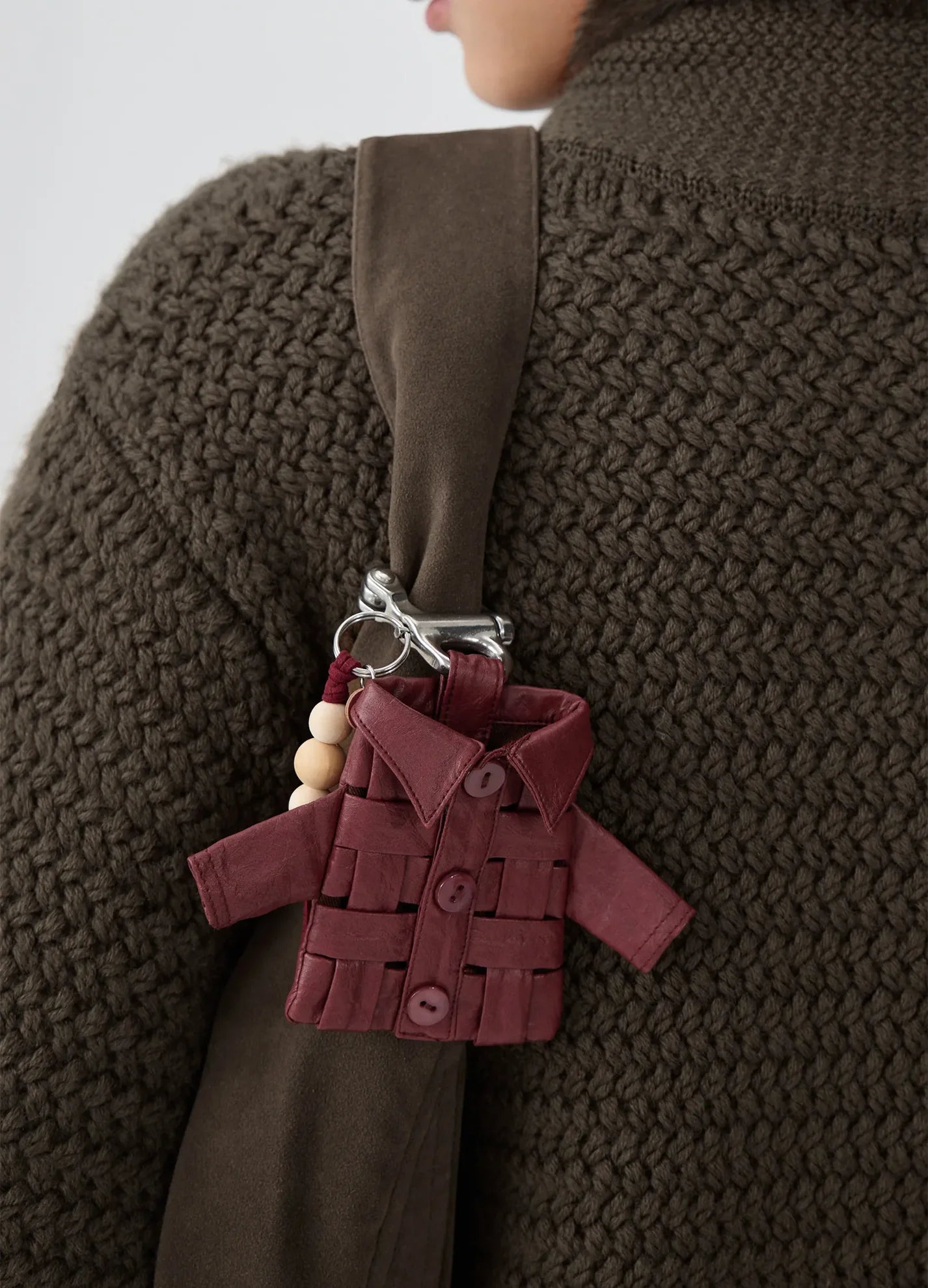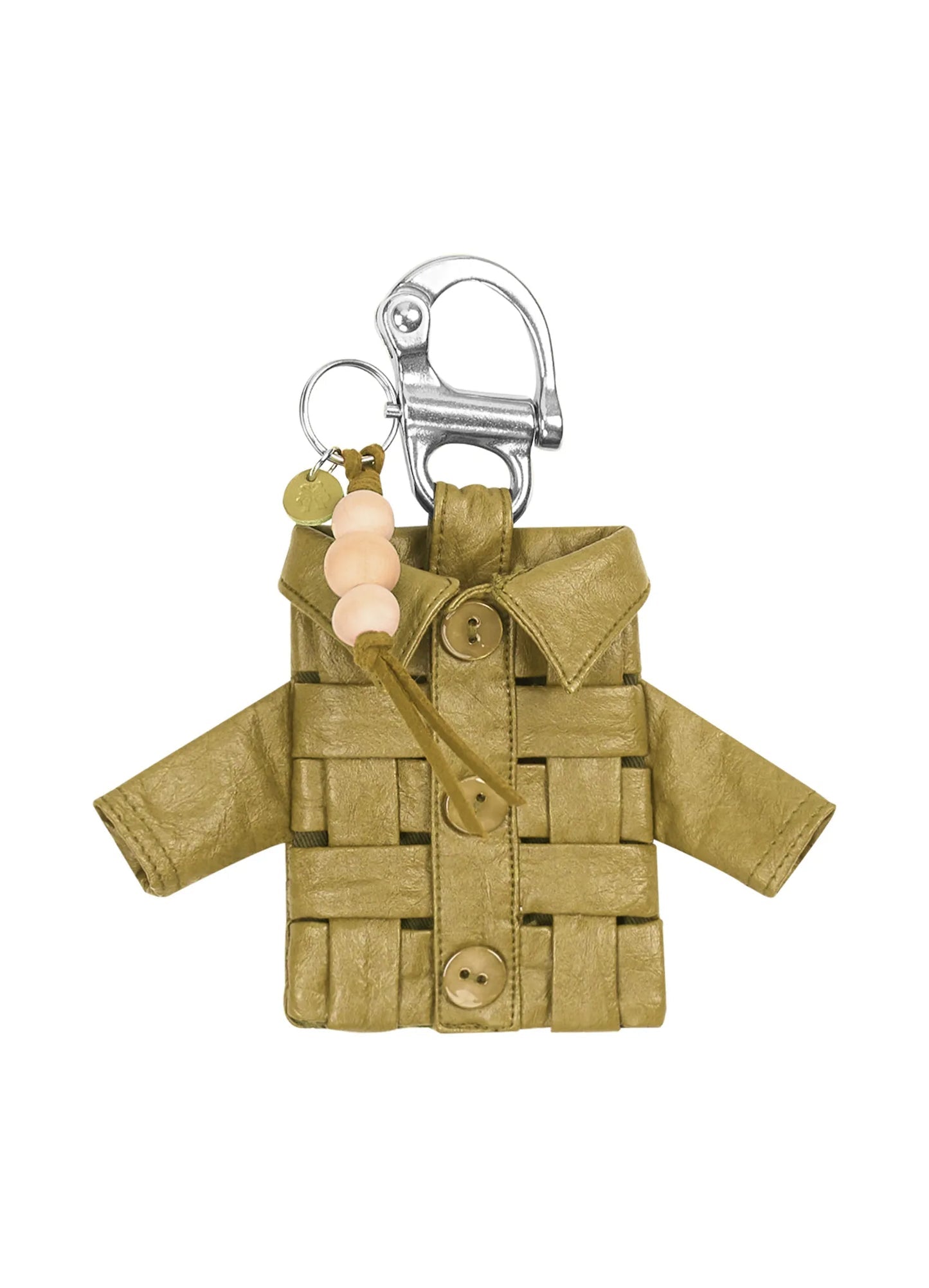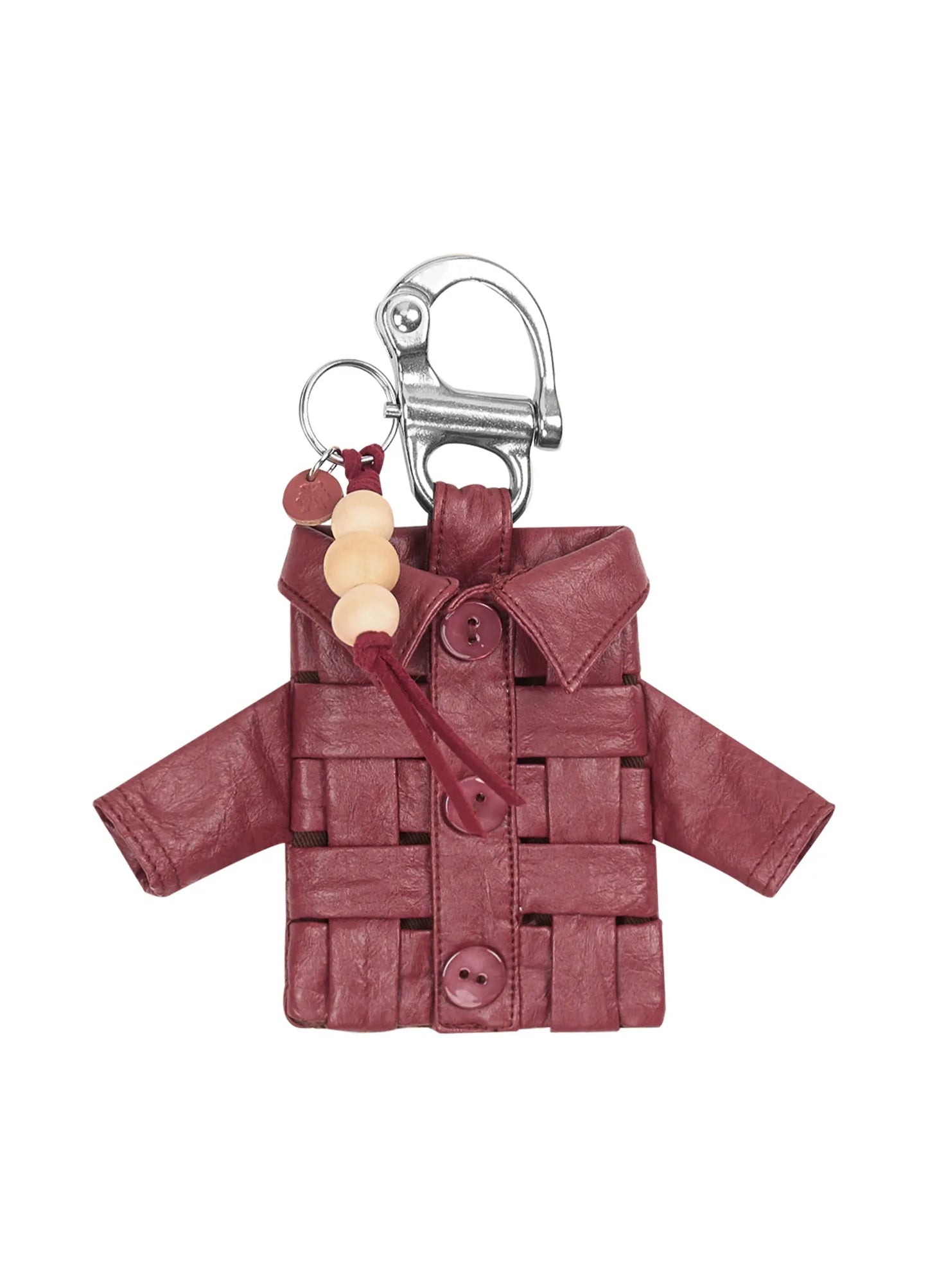 Leather mini shirt keychain with hollow braided weave design and custom shell buttons.