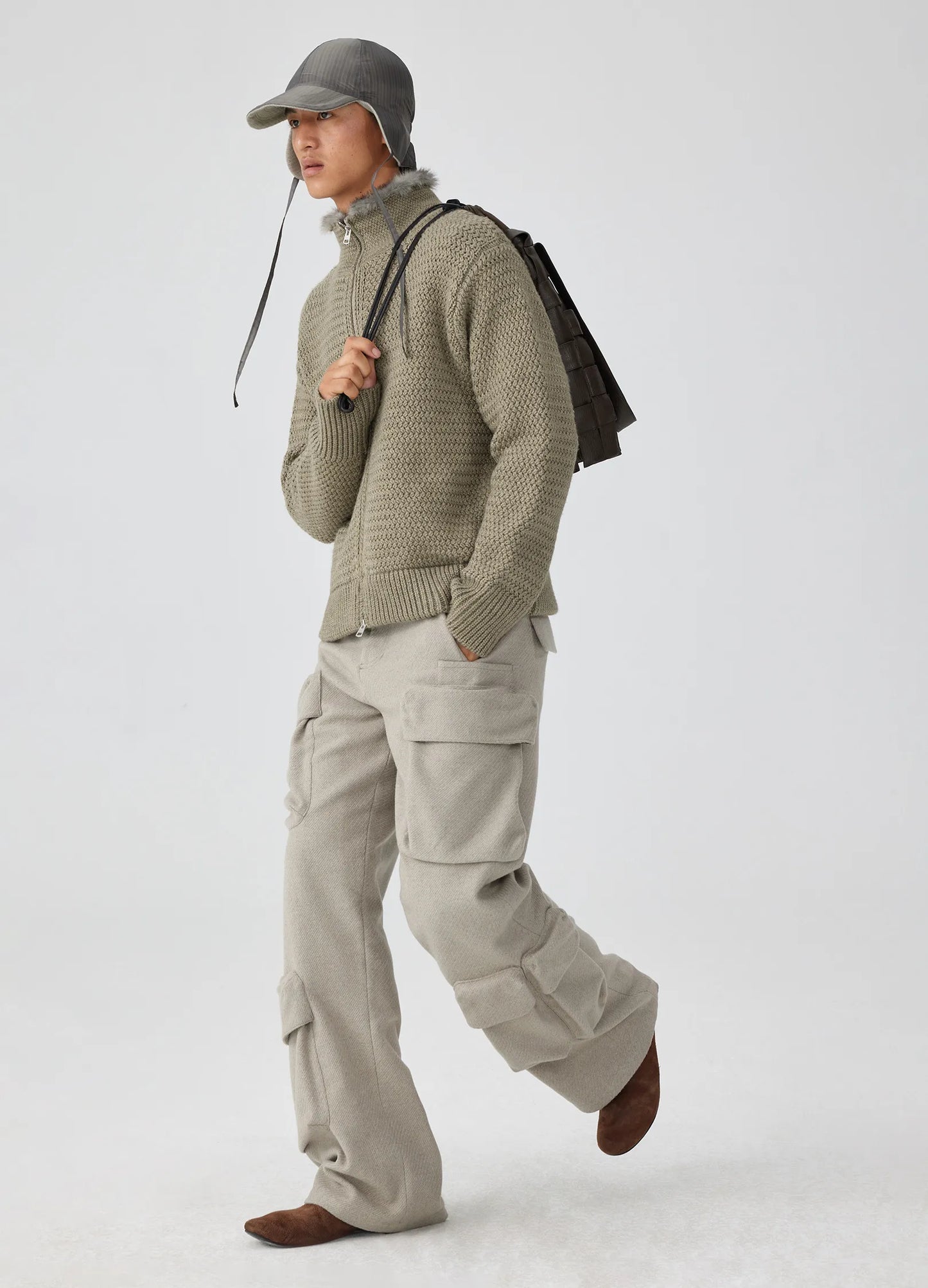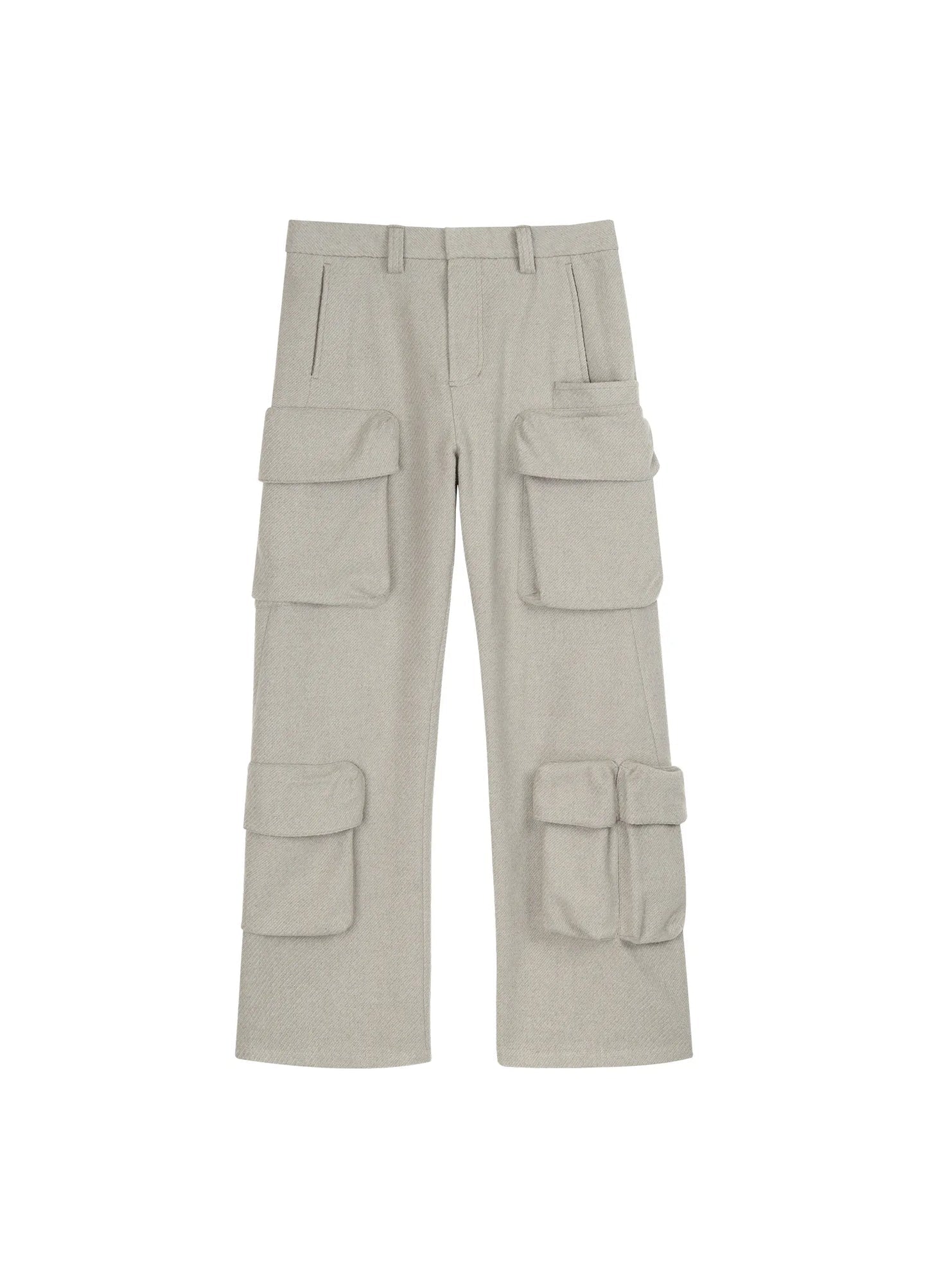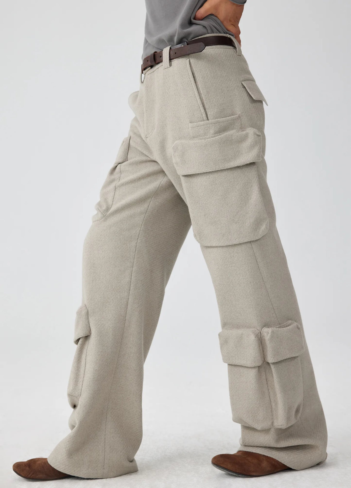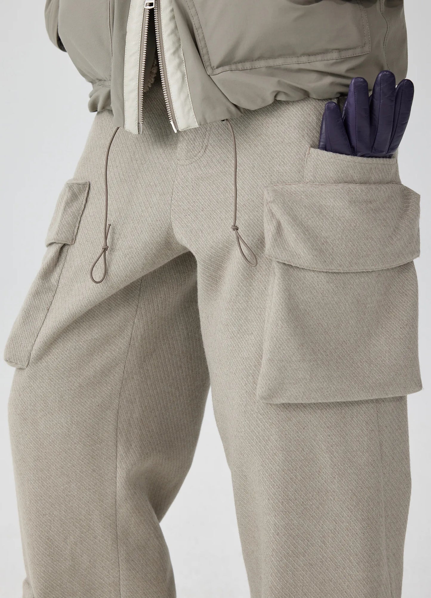Wool blend trousers with 3D cargo pockets and floor-sweeping cuffs, adding volume to the slouchy fit