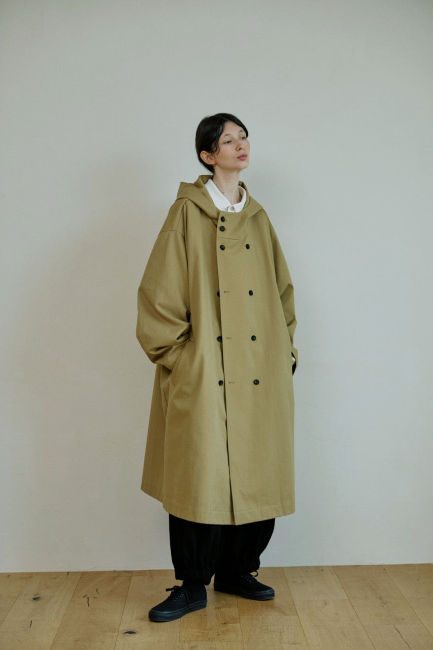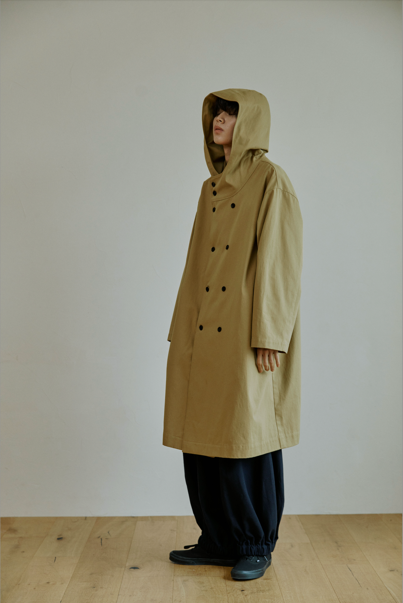 Lightweight trench coat designed for a slightly loose fit. This transitional style features a fun oversized hood and drapey cloak silhouette.