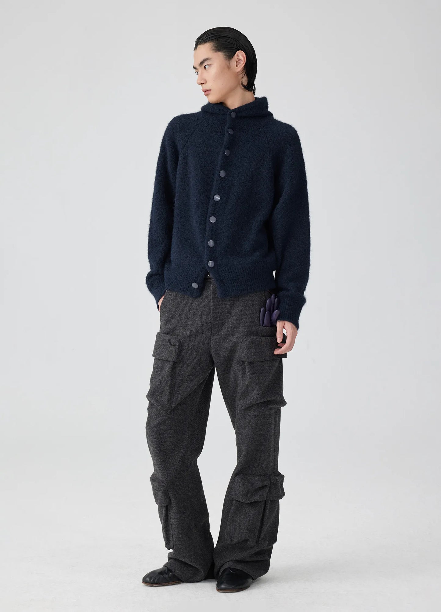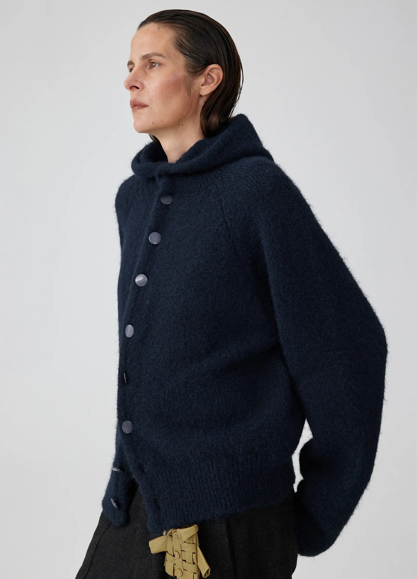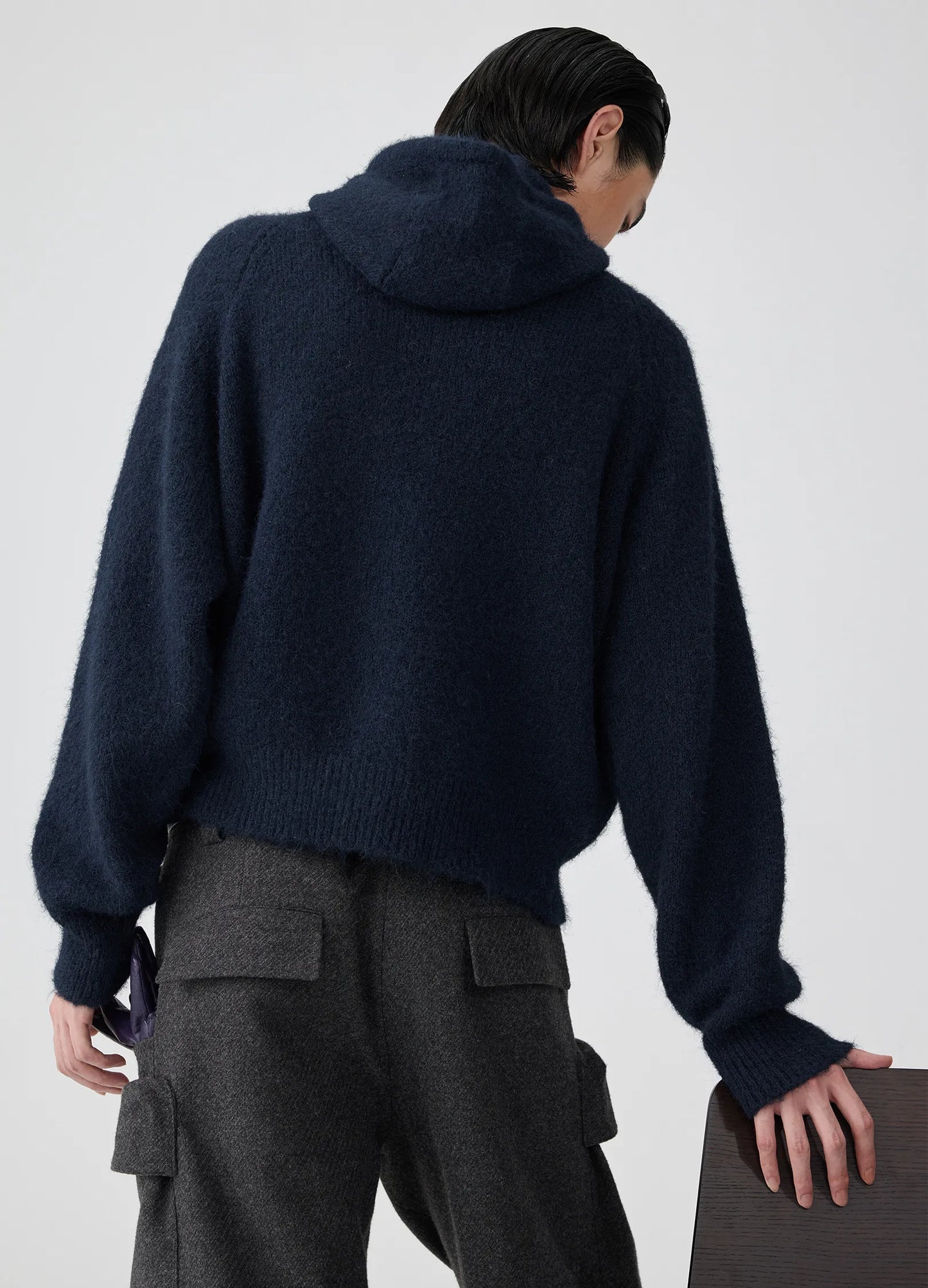 Hooded knit sweater with mohair textured fabric. This breathable wool blend offers year-round versatility without sacrificing warmth.