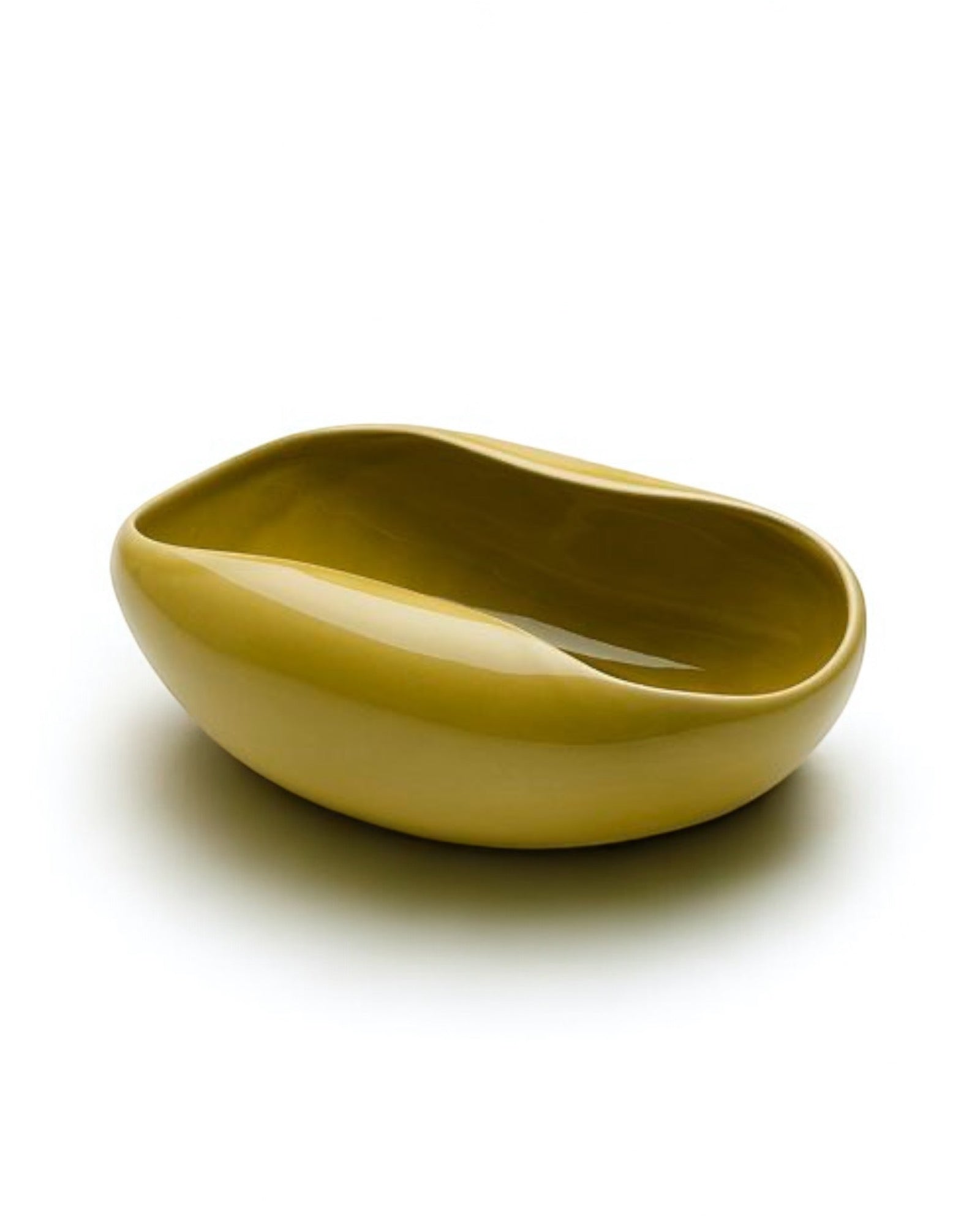 Glossy olive green serving bowl. This sleek mid-century modern piece is perfect for serving or as a unique decorative item. Hand wash only.
