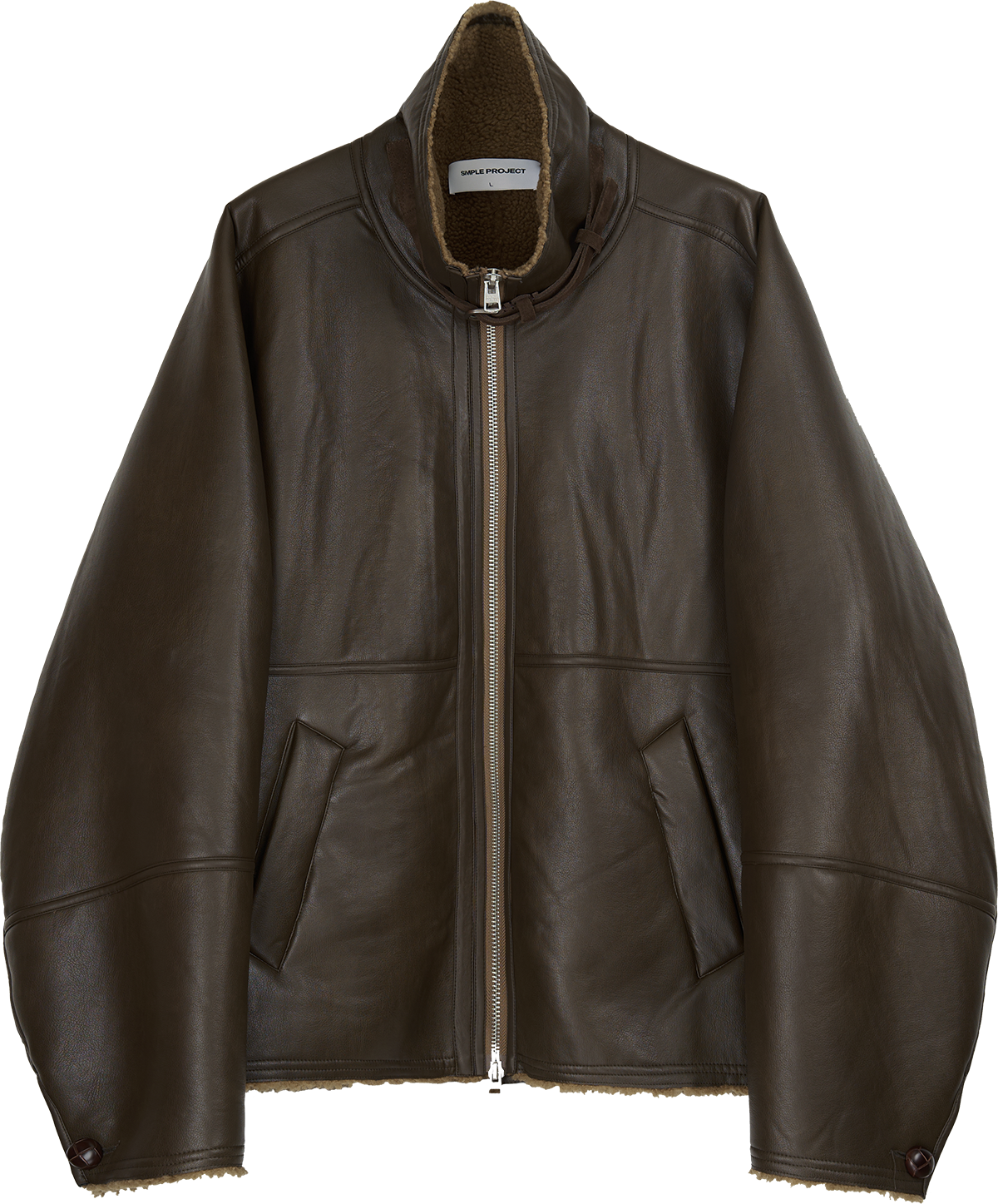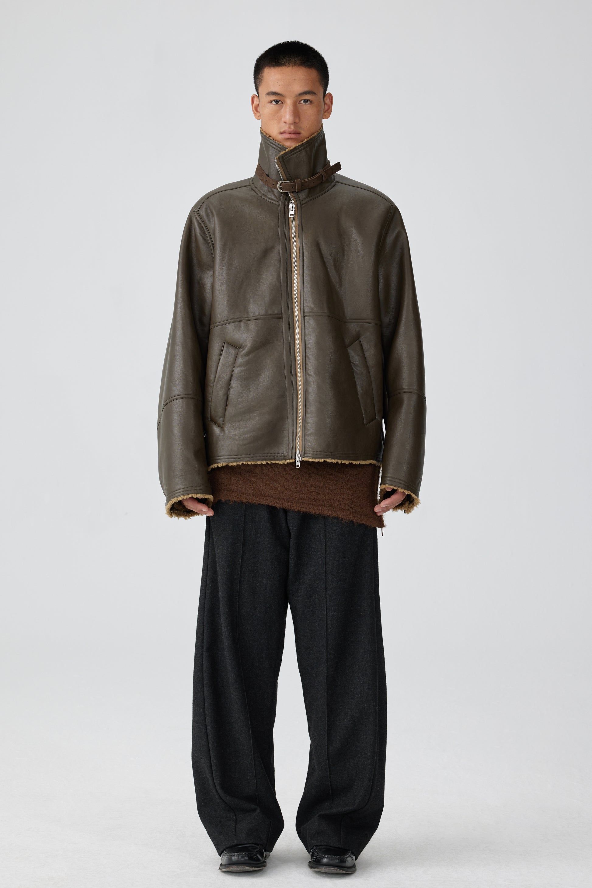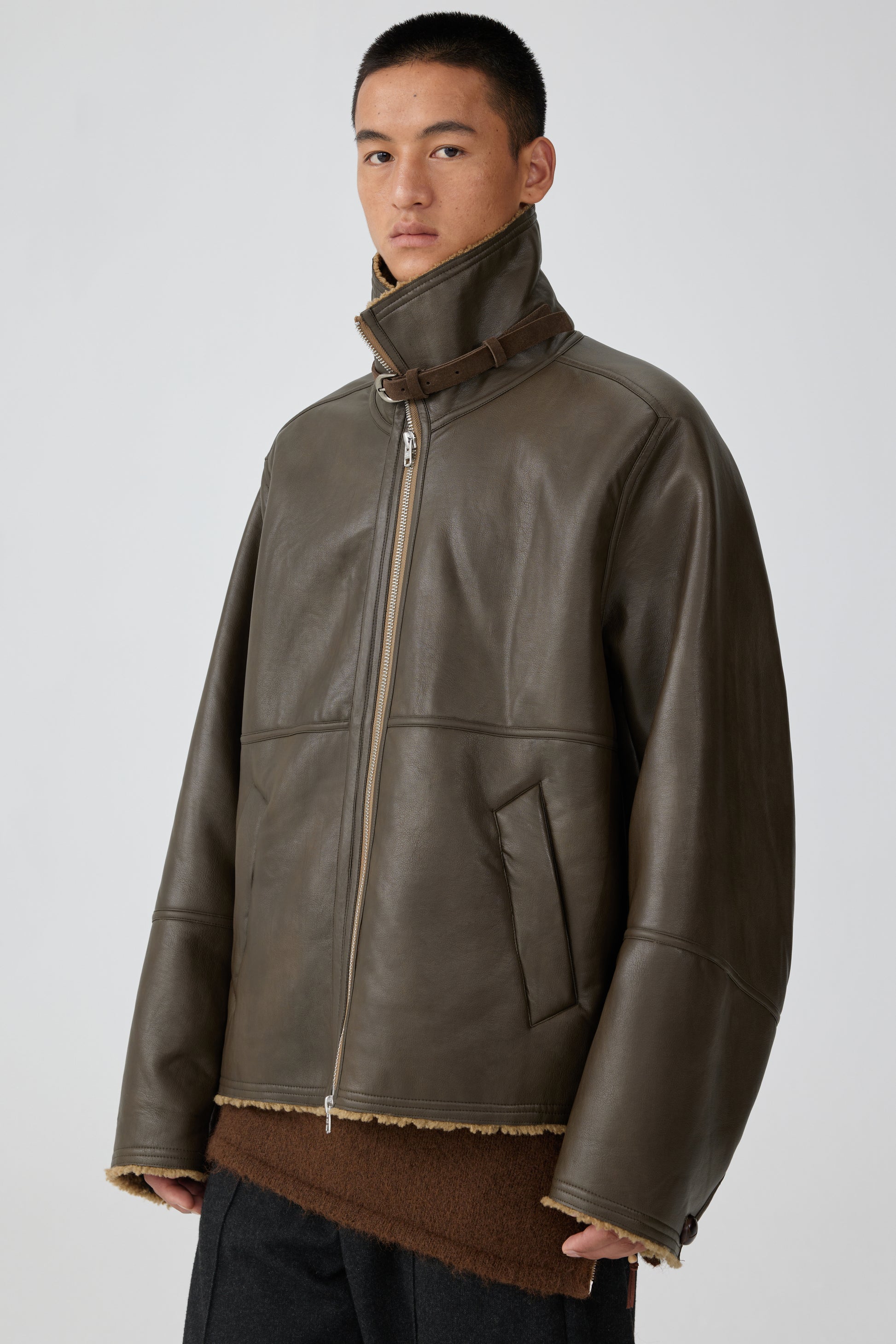 Shearling lined faux leather jacket with front zip and buckle belt fasting at collar.