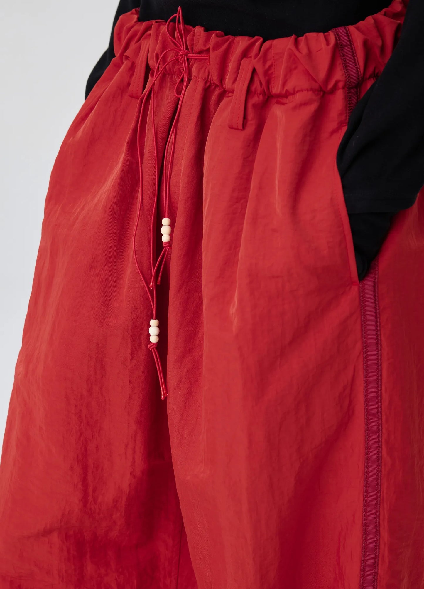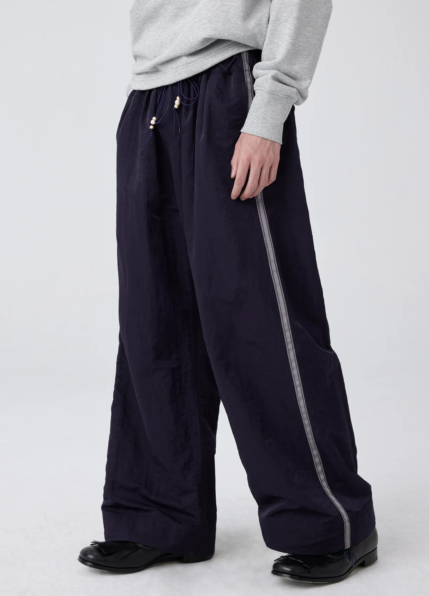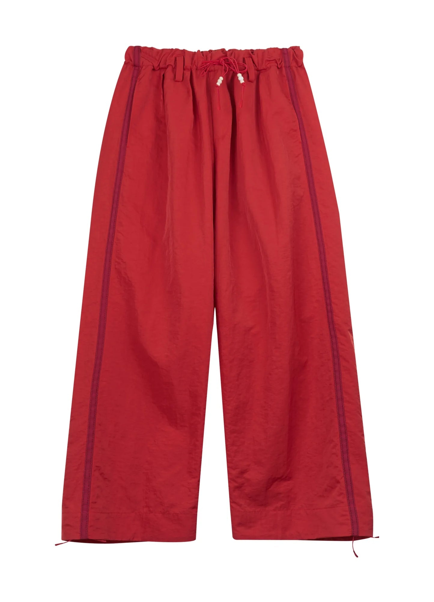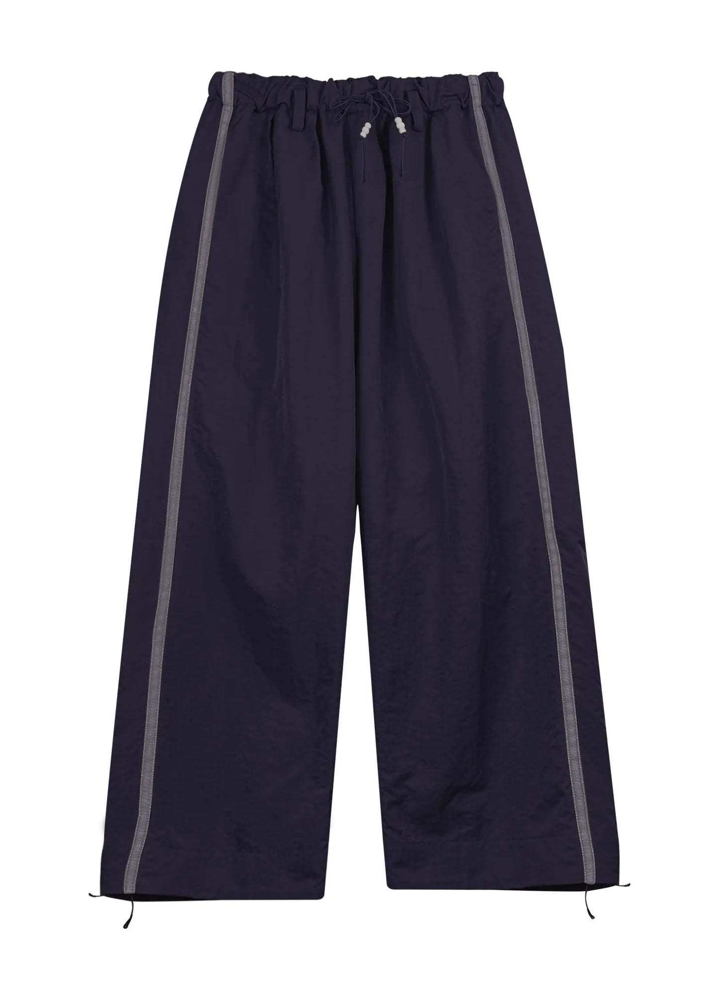 Mid-rise track pant with double stitch contrast side seam detailing and wooden bead drawstring.