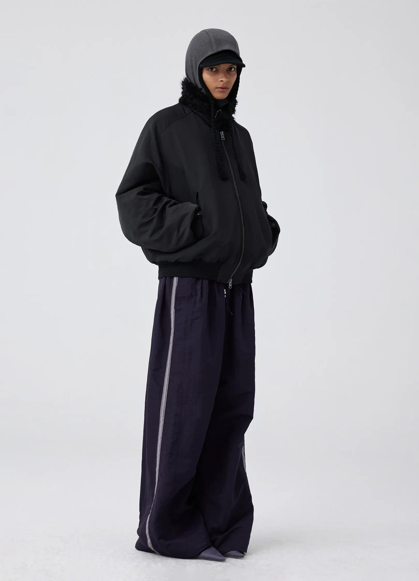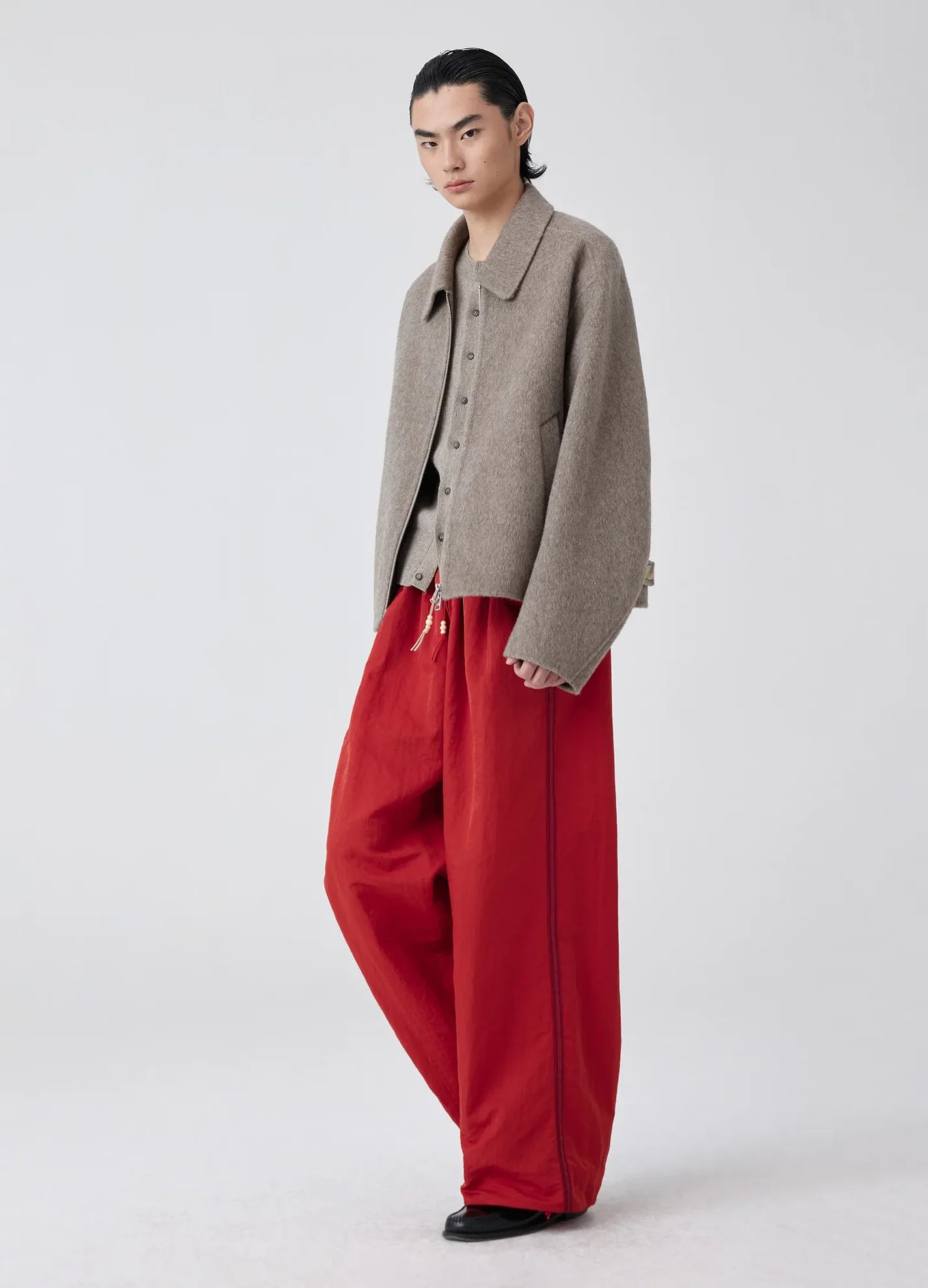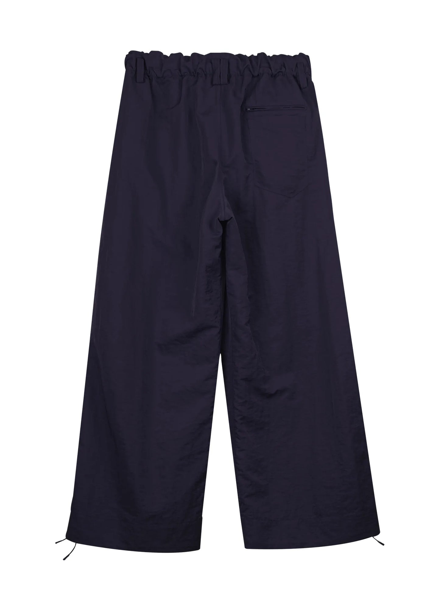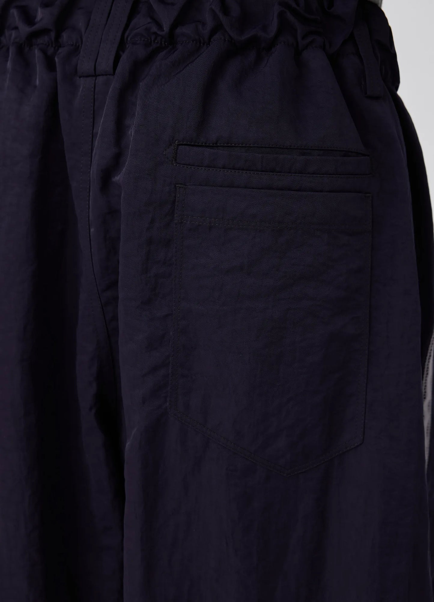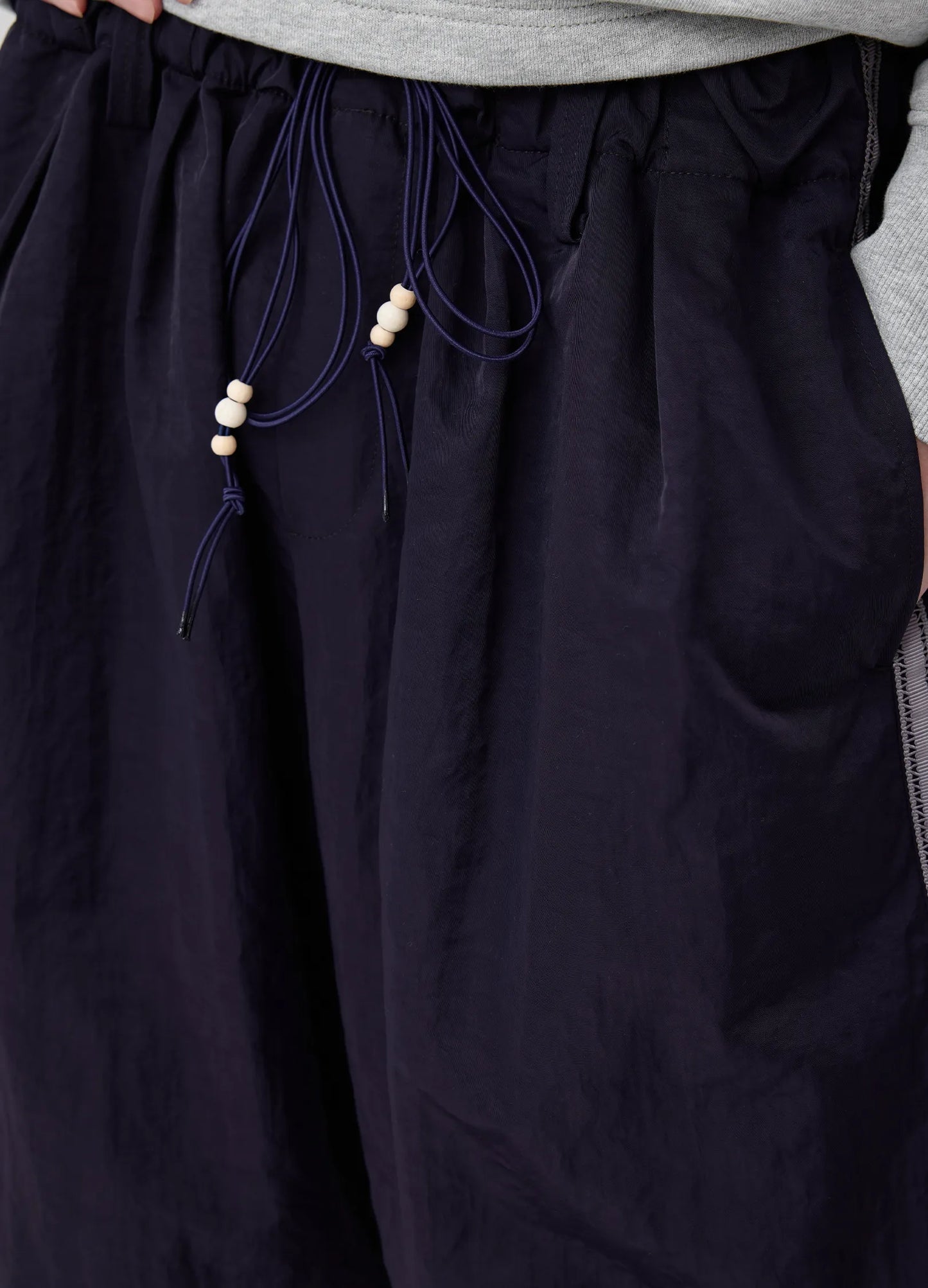 Mid-rise track pant with double stitch contrast side seam detailing and wooden bead drawstring.