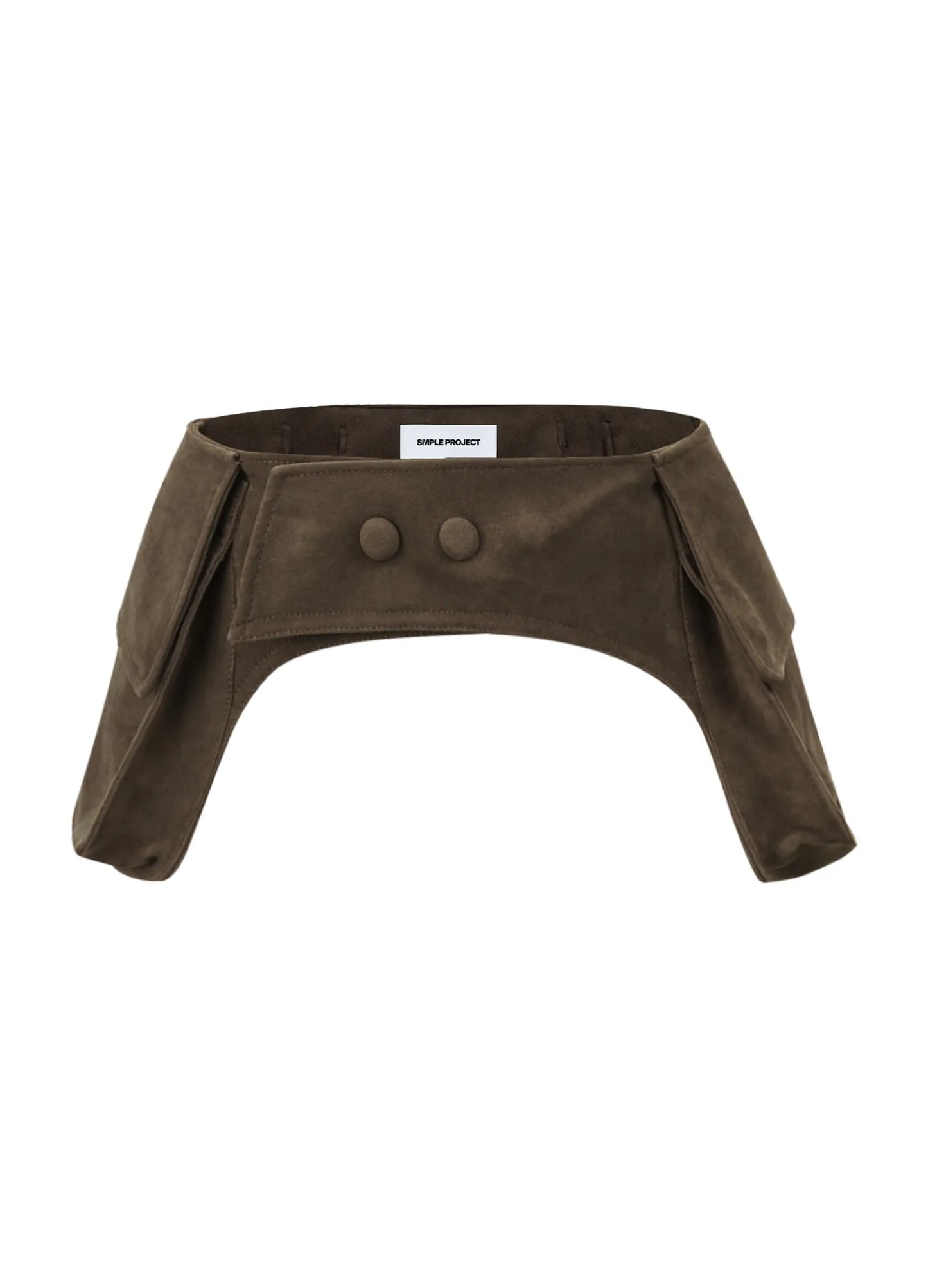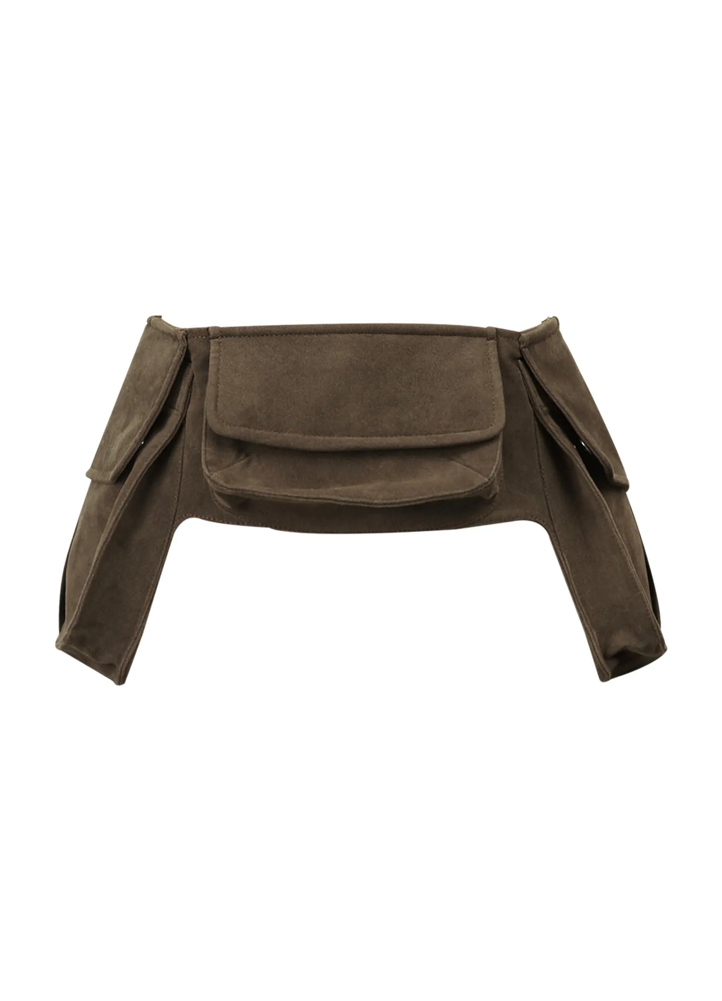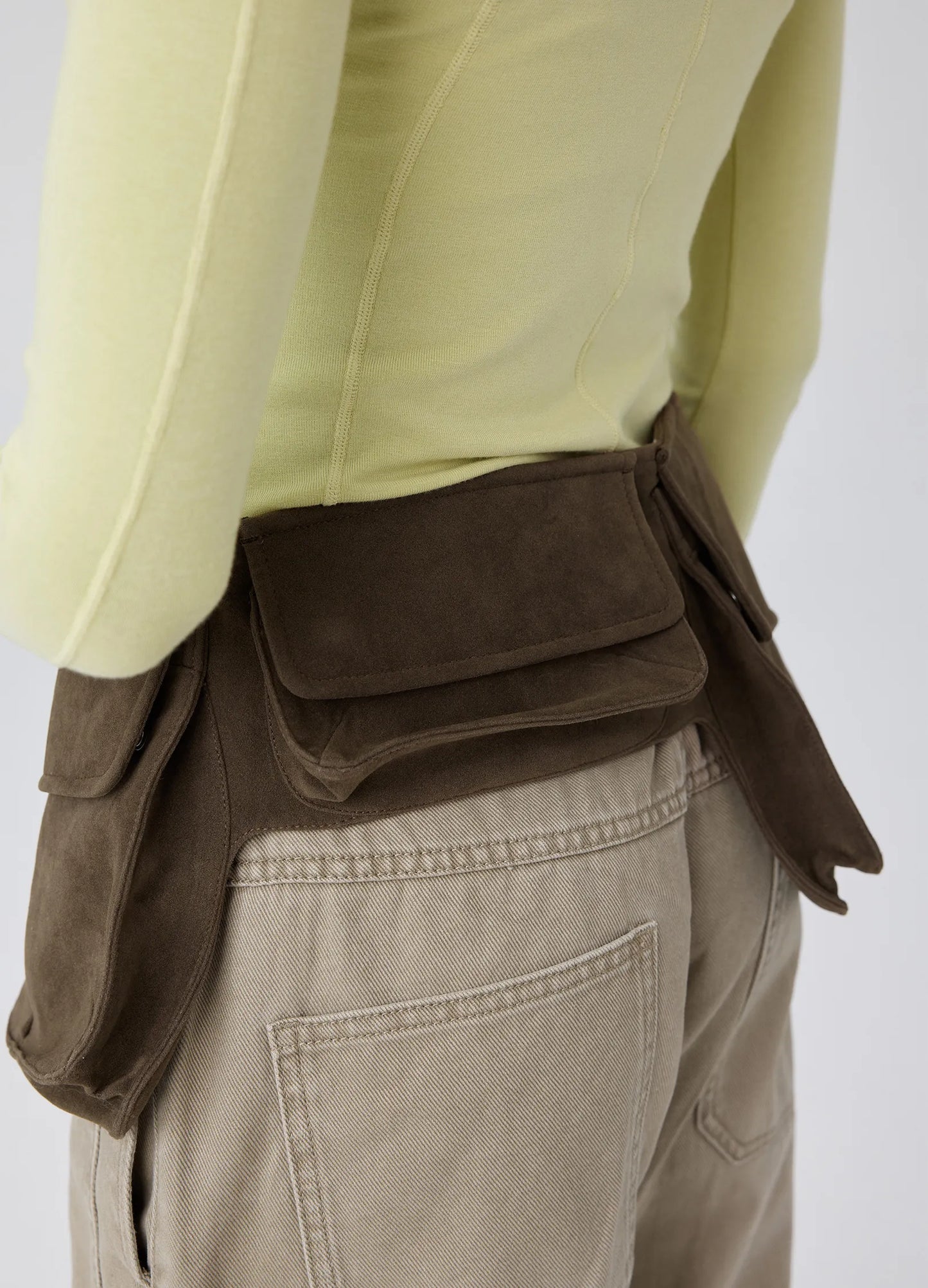 Suede holster with multiple cargo pockets and adjustable waist fastening.