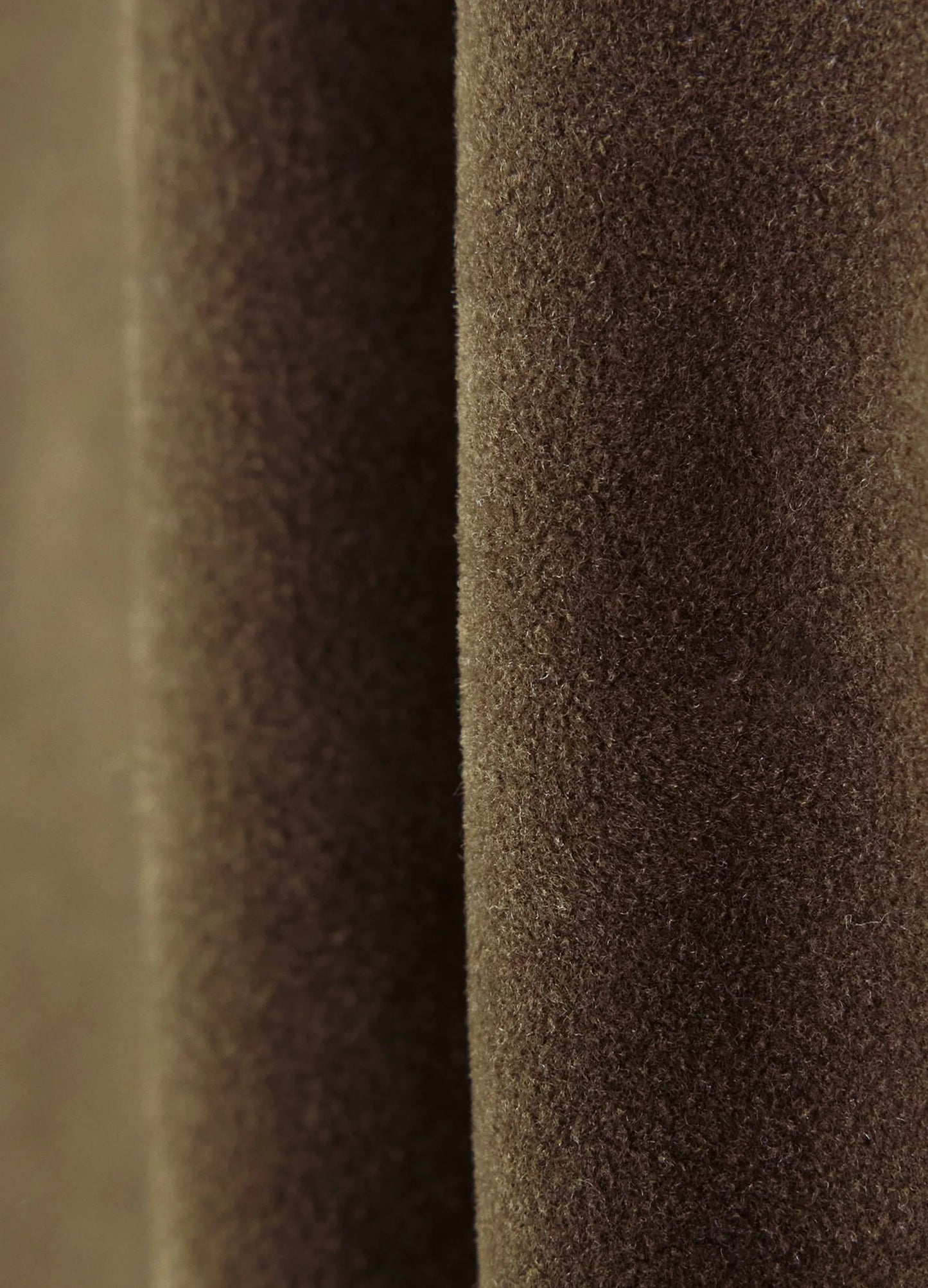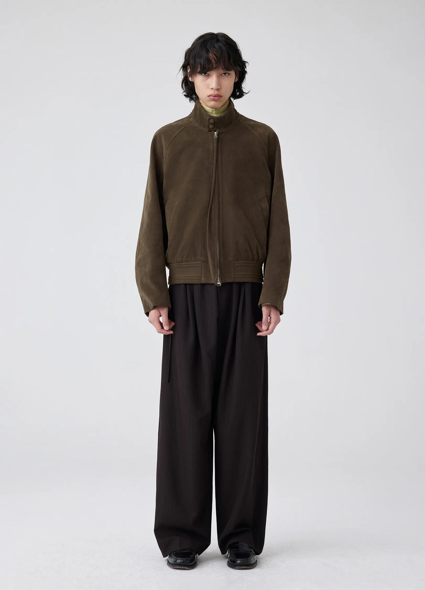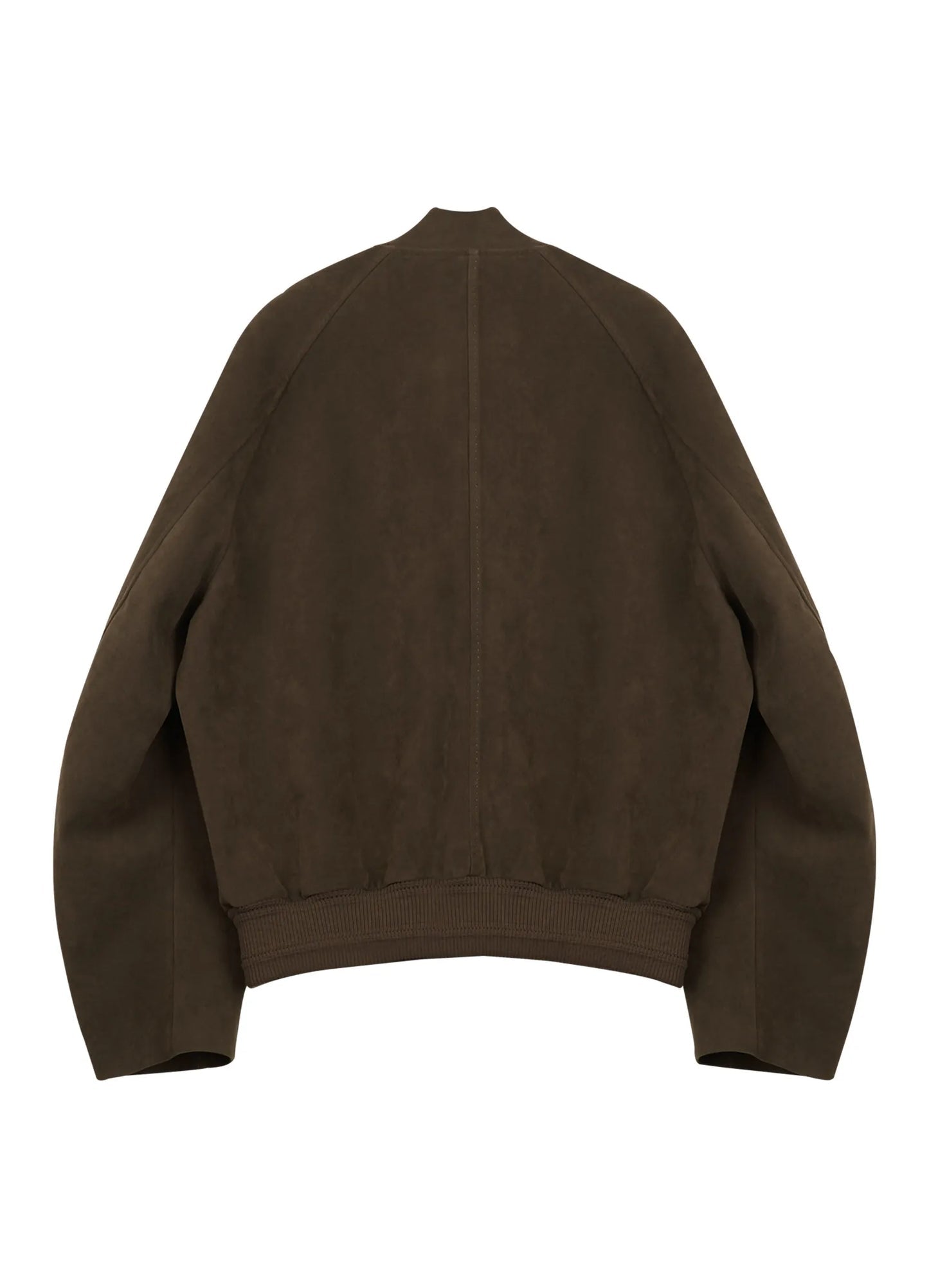 Suede harrington jacket with two-way zipper and button closure stand collar.