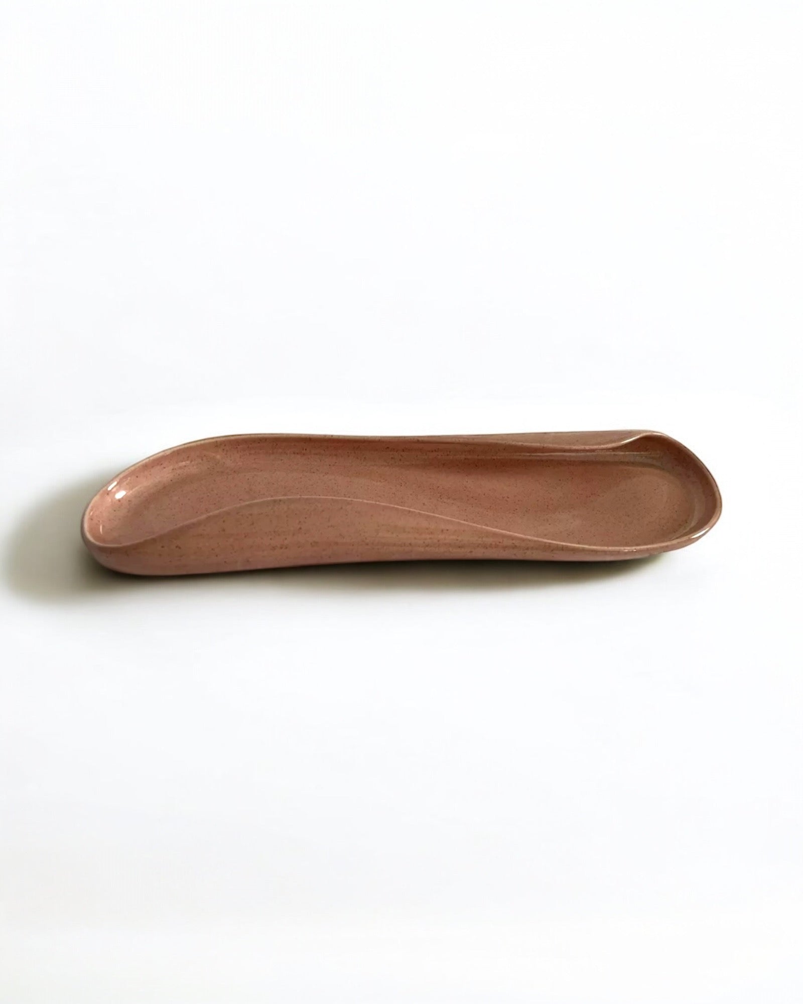 Sculptural ceramic tray with beautiful organic lines. This olive green tray works perfect as a catch-all dish or as a unique decorative item. Hand wash only.