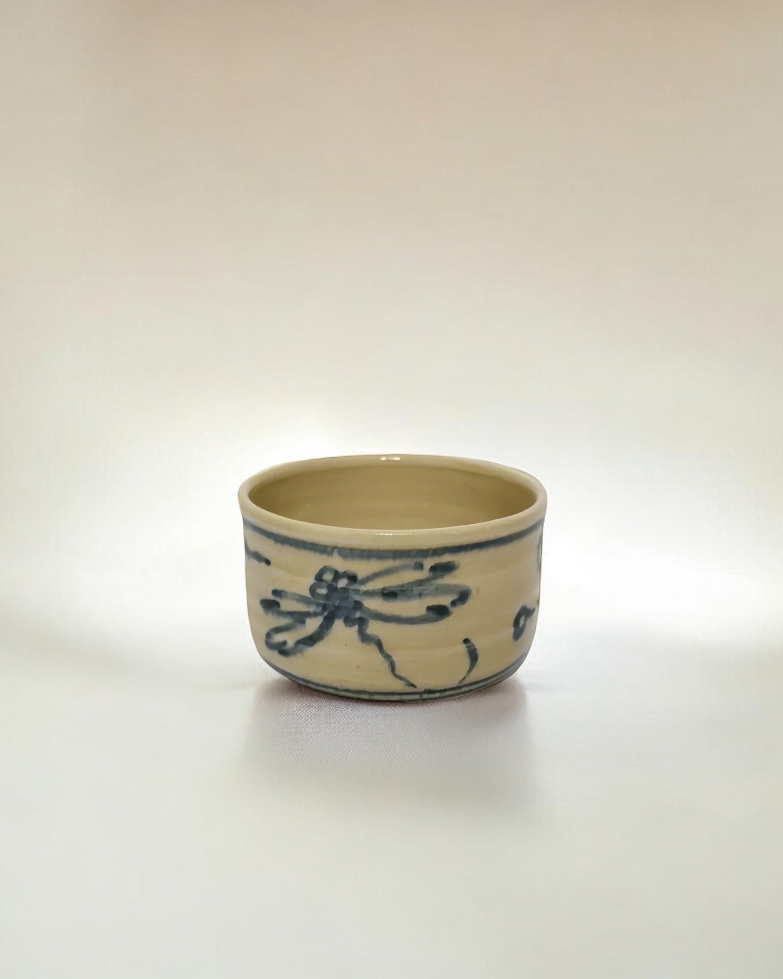 Vintage Japanese matcha bowl with dragonfly painting. Made of annan-ware, handpainted and finished with glaze.